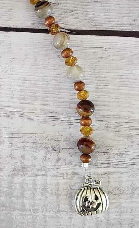 Made in house by Kristin with natural amber agate stone beads, wood beads, faceted glass beads, a 28 mm silver lobster clasp and a pumpkin charm.