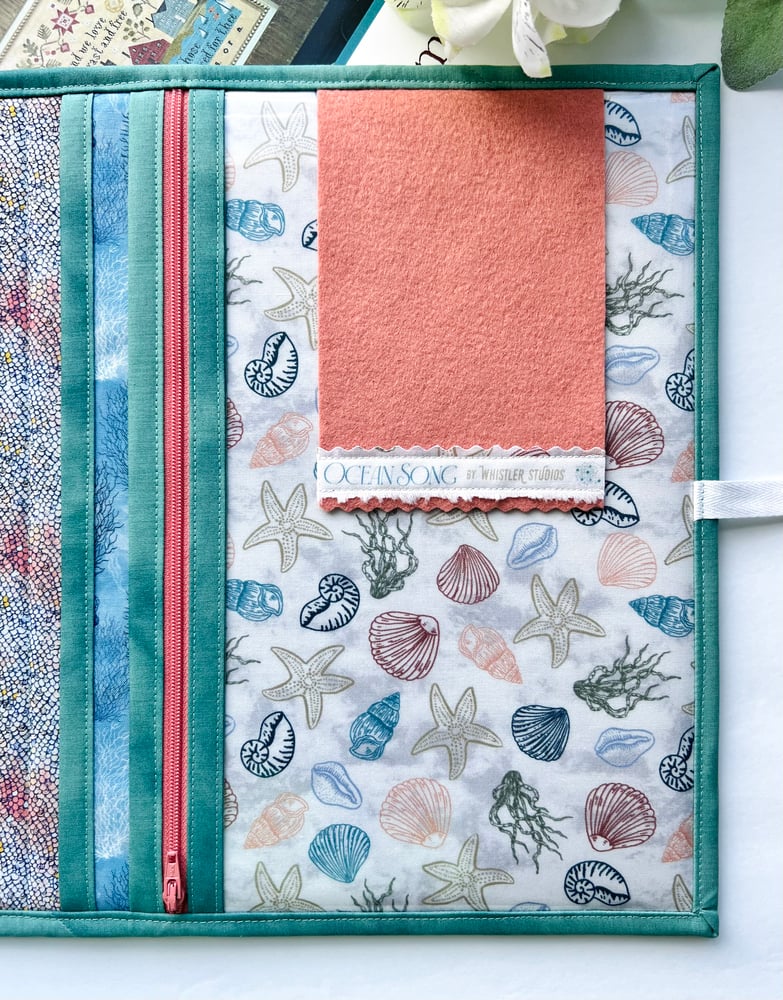 The binding is an aqua green tonal print by Windham also. YKK coral zips. I’ve additionally added a generous sized piece of Benzie felt to this case.